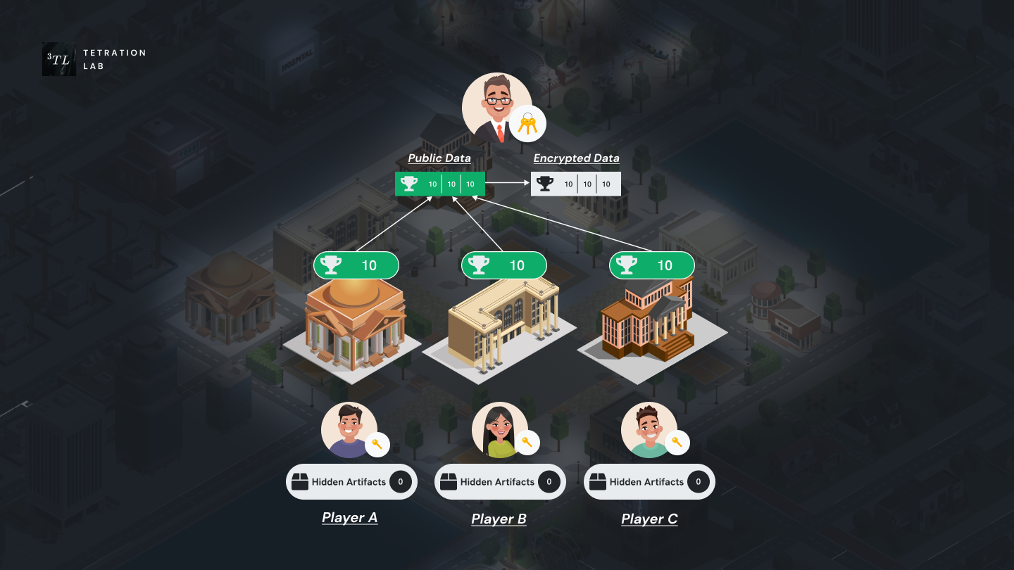 At night players can pay a "special visit" to a museum and might give themself some "souvenirs". In this step, players must create homomorphically encrypted data of the number of artifacts they want to take from each museum (0 means not taking any), encrypted data of the total of artifacts they took, and proof that the sum is correct.